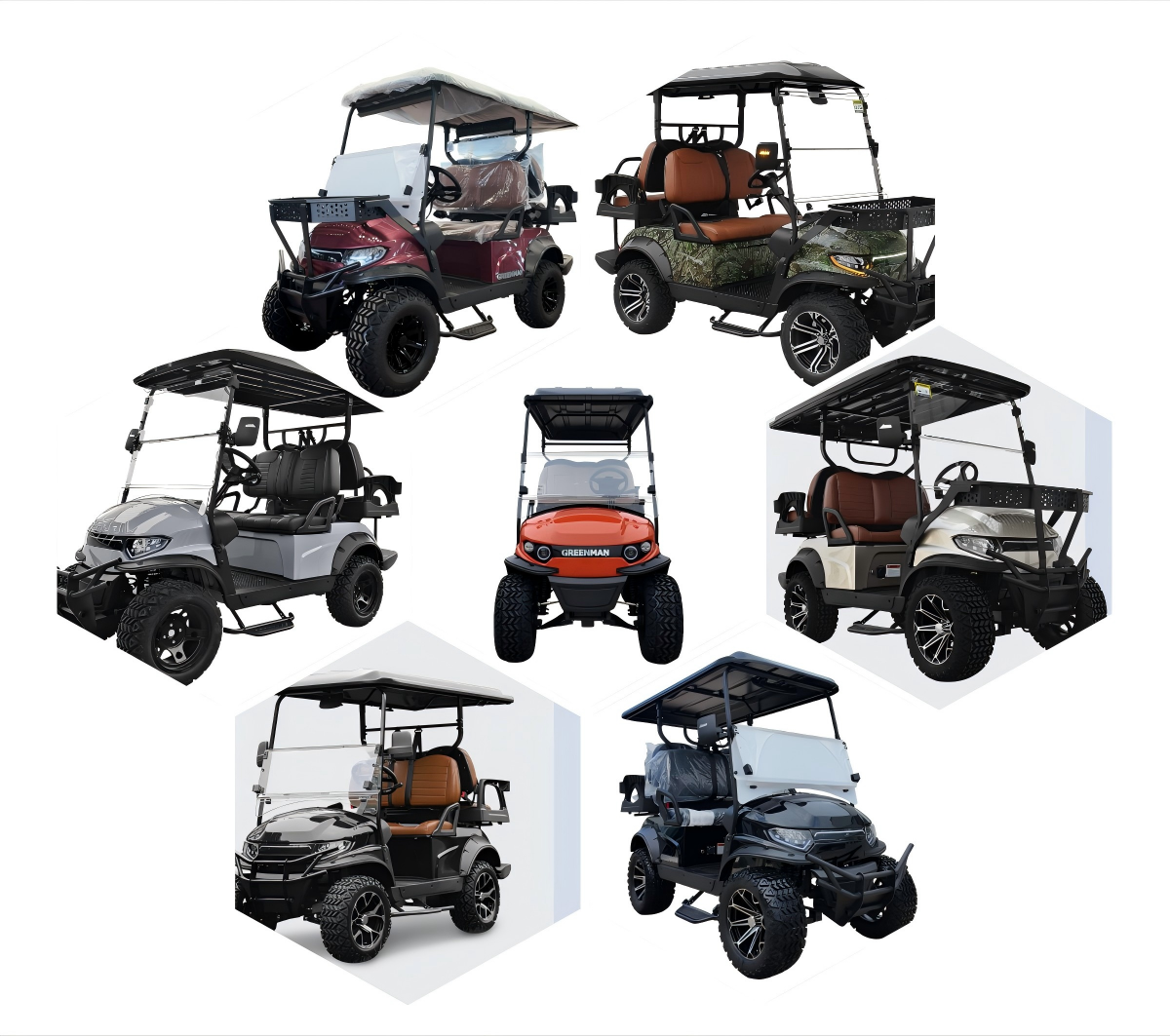 Greenman electric Electric Lifted Car, UF2+2 model, with a solid aluminum alloy frame, light weight, strong corrosion resistance, and long service life. The front headlights run through the lights and the combined rear taillights create a strong and domineering visual effect, with smooth overall lines. The folding windshield and plastic hinge buckle design make operation more convenient and efficient. Ergonomically designed seats and backrests provide worry free driving experience, combining comfort and practicality. Customize seat colors, seat patterns, customer exclusive logos, etc. according to customer requirements. The added metal anti-collision bumper allows the vehicle to drive freely and perfectly in harsh conditions. Due to the relatively high overall height of off-road vehicles, they can be equipped with foot pedals, making driving and riding more relaxed and comfortable. The whole vehicle is equipped with three-point seat belts, which can safely and smoothly drive on rugged rural roads. The design of back-to-back flip seats has separate storage space, achieving multi-purpose use for one vehicle. Customers can choose a luxury dashboard according to their needs, which integrates multimedia screens and can display multiple modules. There is also a multifunctional storage box, which is convenient for storing mobile phones, water bottles, personal belongings, etc. USB interface can also be optionally installed to charge the phone. A navigation system can be installed to enhance the overall functionality of the vehicle.